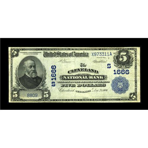 <B>Cleveland, TN</B></I> - $5 1902 Plain Back Fr. 600 <B>The Cleveland NB</B></I> Ch. # (S)1666<BR>This moderately circulated issue is a standout among the large size known on this bank and may well be one of the finest two or three pieces known. More interesting to note is the Christmas Day plate date, December 25, 1906. The signatures have faded with age, though the overall eye appeal of the note is pleasing. <B>Very Fine.</B></I><BR><BR><b>Shipping:</b> Coin/Currency (<a target="_blank" href="http://www.heritageauctions.com/common/shipping.php">view shipping information</a>)