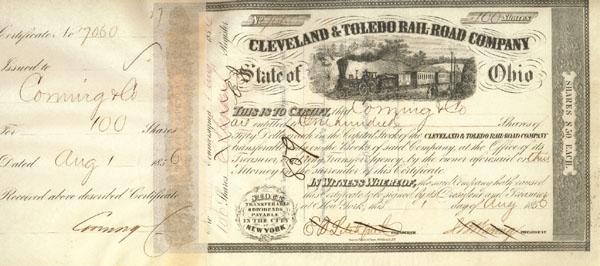 1854, Ohio. Stock certificate for 100 shares. Black. Vignette of train at top center. Pen cancelled. Very fine.