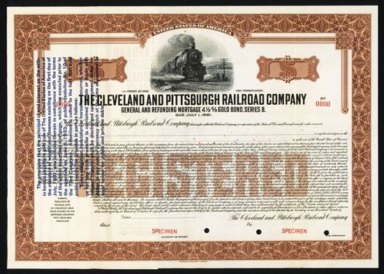 Pennsylvania and Ohio. 19xx (ca.1933). General and Refunding Mortgage 4 1/2% Gold Bond, Series B. Brown border. Train passing track workers and telephone poles. ABNC. Specimen, XF. Rare legend added to bond to inform the buyer that the Gold clause has been changed and the bond is payable in legal tender only, not gold. This clause has been found on only a handful of certificates.
