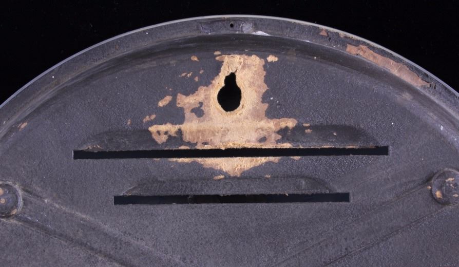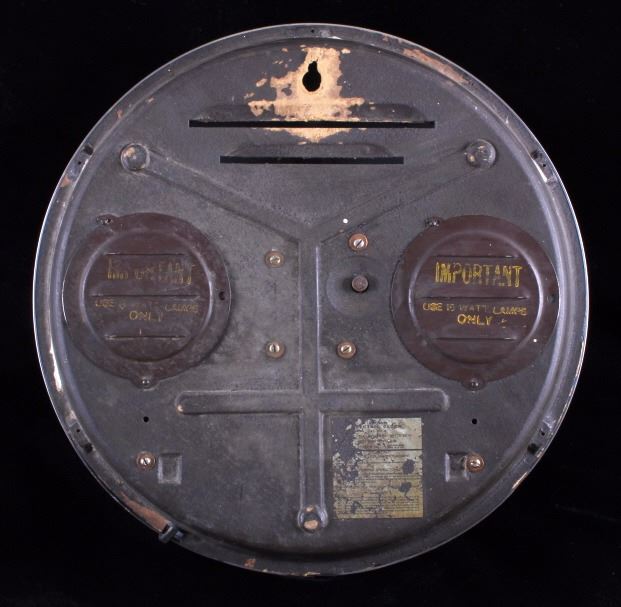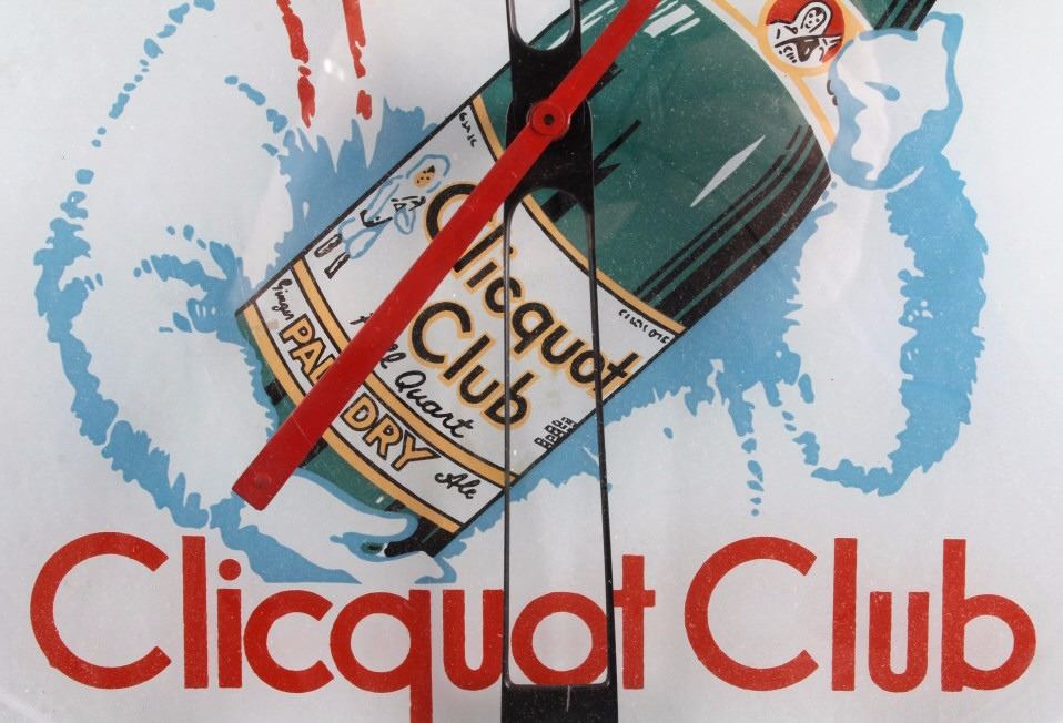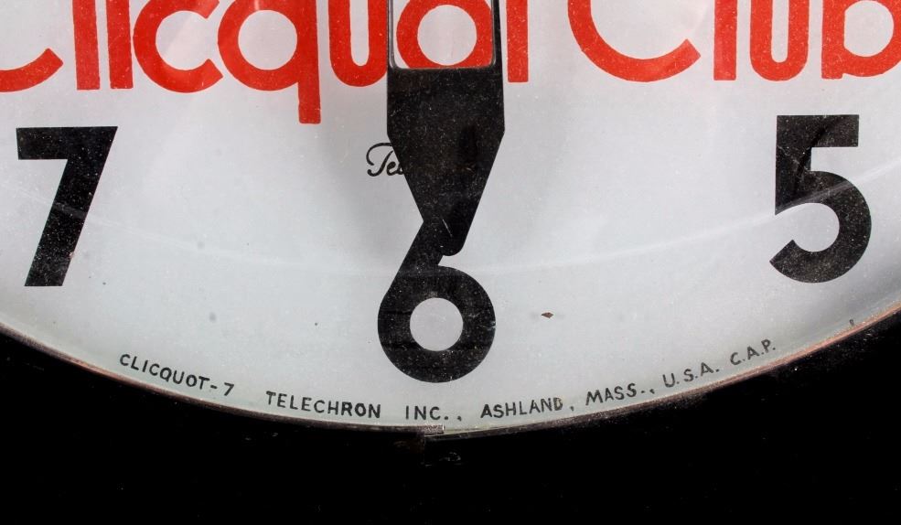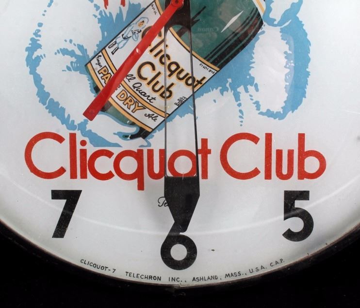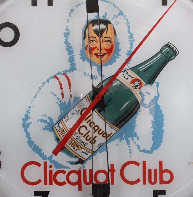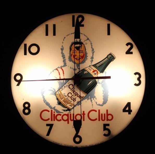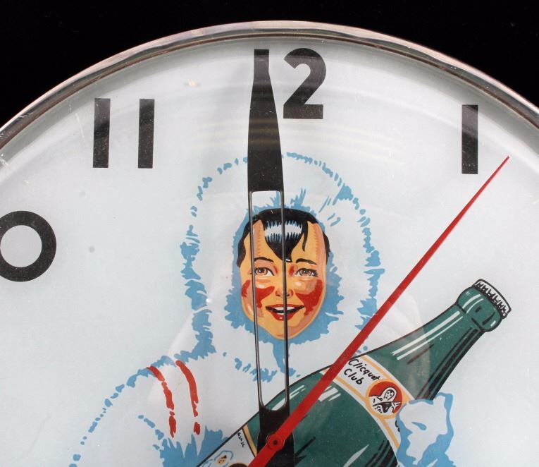 This is an original Clicquot Club Pale Dry Ginger Ale wall clock from Butte, Montana. The clock was made during WWII and features a fiberboard back as steel was conserved for the war effort during that time. The face of the clock shows an Eskimo holding a bottle of ginger ale. The clock is lit by two bulbs inside. The clock is in good condition. It has been tested and is in good working condition as well. The clock measures