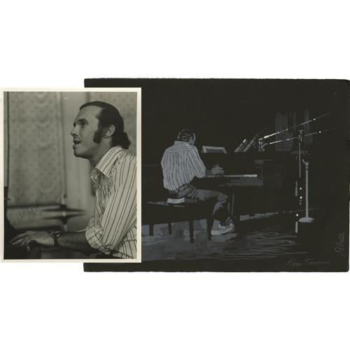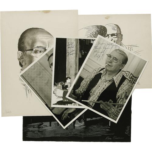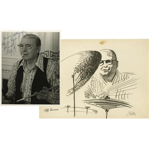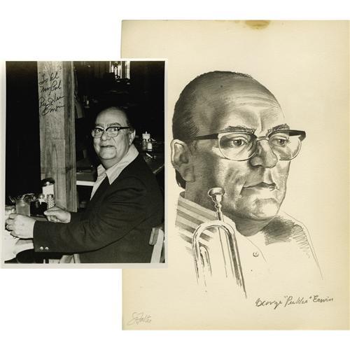 <B>Cliff Leeman, Ross Tompkins, and Pee Wee Erwin - John Falter Lithographs and Autographed Al White Silver Prints, Group of 6 (Various).</B></I> Cliff Leeman (drums), Ross Tompkins (piano), and Pee Wee Erwin (trumpet) are the focus of artist John Falter's three lithographs (each signed by Falter). Al White was at the same jazz parties and shot three photographs of the very same musicians, and each signed his image. John Falter's lithographs each have an overall size of 11" x 15", and they average Very Good condition. Al White's silver prints each measure 8" x 10", and they are in Excellent condition. <I>From the Al White Jazz autograph archive.</B></I>