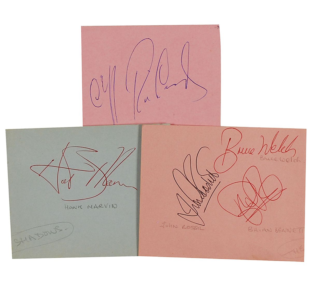 Vintage ballpoint signatures of Cliff Richard, Bruce Welch, Brian Bennett, Hank Marvin, and John Rostill on three 5 x 4 colored album pages, with collector’s notations under most of the signatures. In fine condition, with Richard’s page affixed to an identical size board. Accompanied by a certificate of authenticity from Tracks.