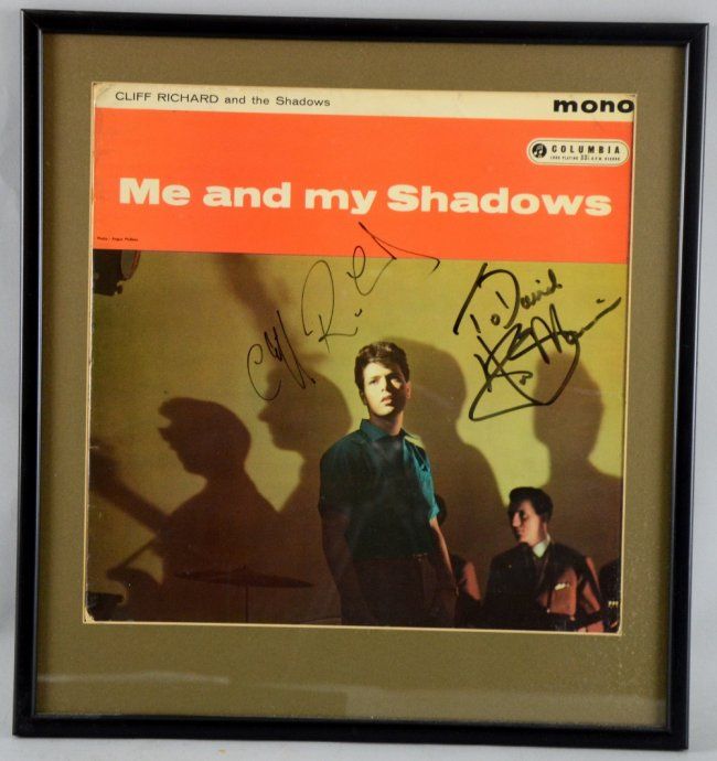 Cliff Richard and the Shadows 'Me and my Shadows' Vinyl LP signed to front cover by Cliff Richard & Hank Marvin, framed & glazed Provenance: From 1987 to 1995 the vendor was the head of music purchasing for the BBC Gramophone Library housed at Egton House (Radio 1) top of Regent St, in London. Most of the autographs come from that period. From 1995 to 2002 I was the senior Producer for Music Choice Europe (Sky Digital) and interviewed many artists. From 2002 I discovered and managed the Jazz singer (and now Radio 2 presenter) Clare Teal with who I met lots of other artists while on tour working with Sony Records. 15? x 14?in. (38 x 36cm)