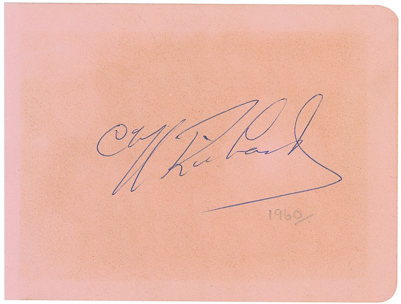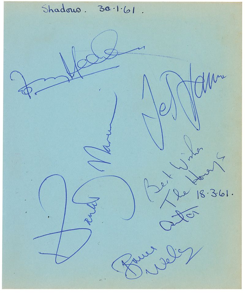 Vintage ballpoint signature, “Cliff Richard,” on a light pink 5.5 x 4 album page; and vintage ballpoint signatures of five Shadows on a 5.25 x 6.5 light blue album page, with both pages having small collector’s notations. In fine condition, with uniform block of toning over Richard’s signature and some light edge toning to other page. Accompanied by a certificate of authenticity from Tracks.