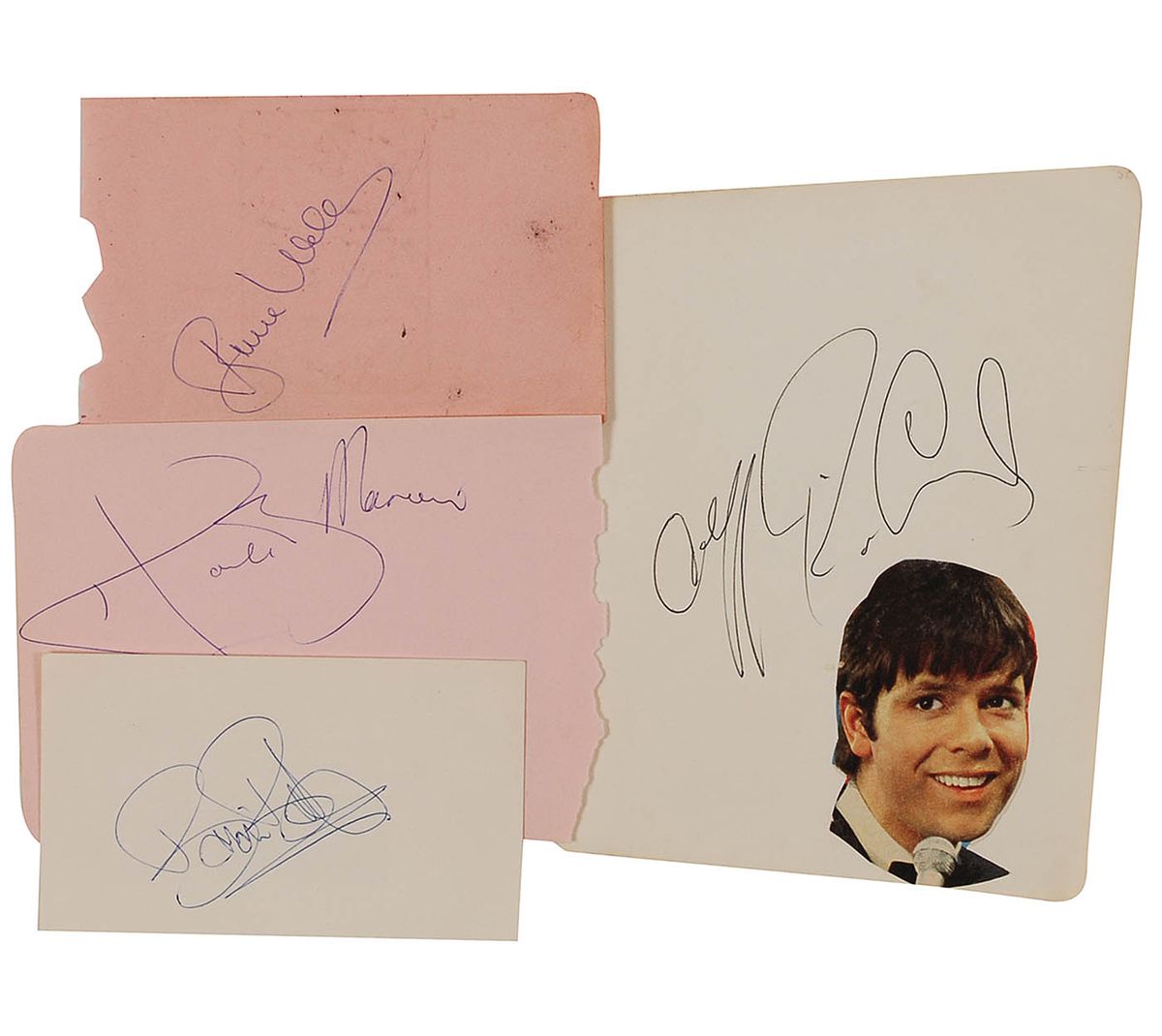 Vintage ballpoint signatures of Cliff Richard, Bruce Welch, Hank Marvin, and Brian Bennett on various size album pages and cards, with a clipped photo of Richard affixed to his page. In fine condition, with light soiling to one page.