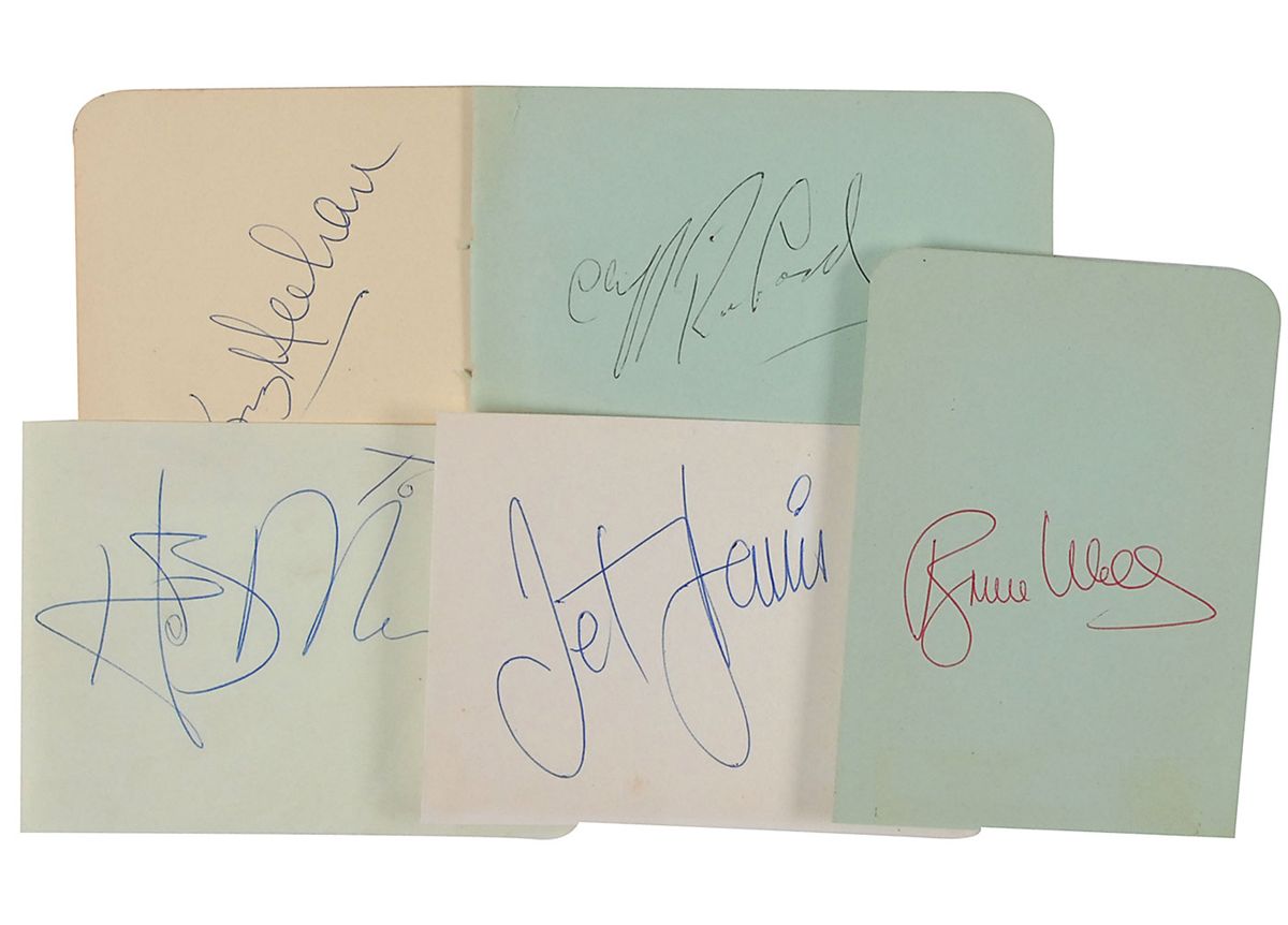 Vintage ballpoint signatures of Cliff Richard, Bruce Welch, Tony Meehan, Hank Marvin (ins), and Jet Harris on individual 4.75 x 3.25 album pages. In overall fine condition.