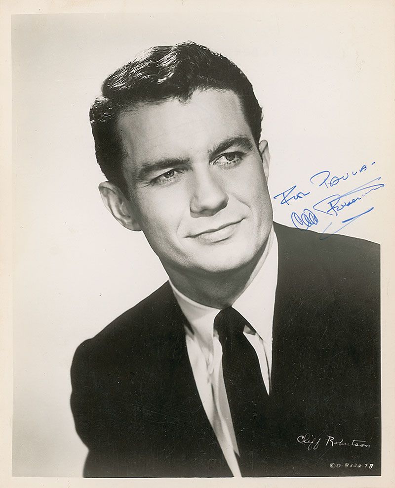 Glossy 8 x 10 photo, signed and inscribed in blue ink to Movie Star News’s Paula Klaw, “For Paula—Cliff Robertson.” In fine condition, with a vertical crease along left side.
