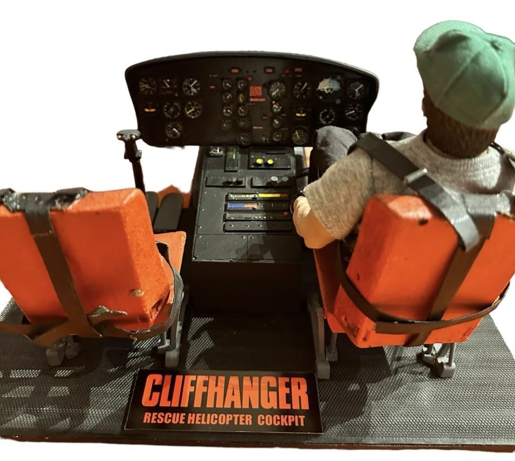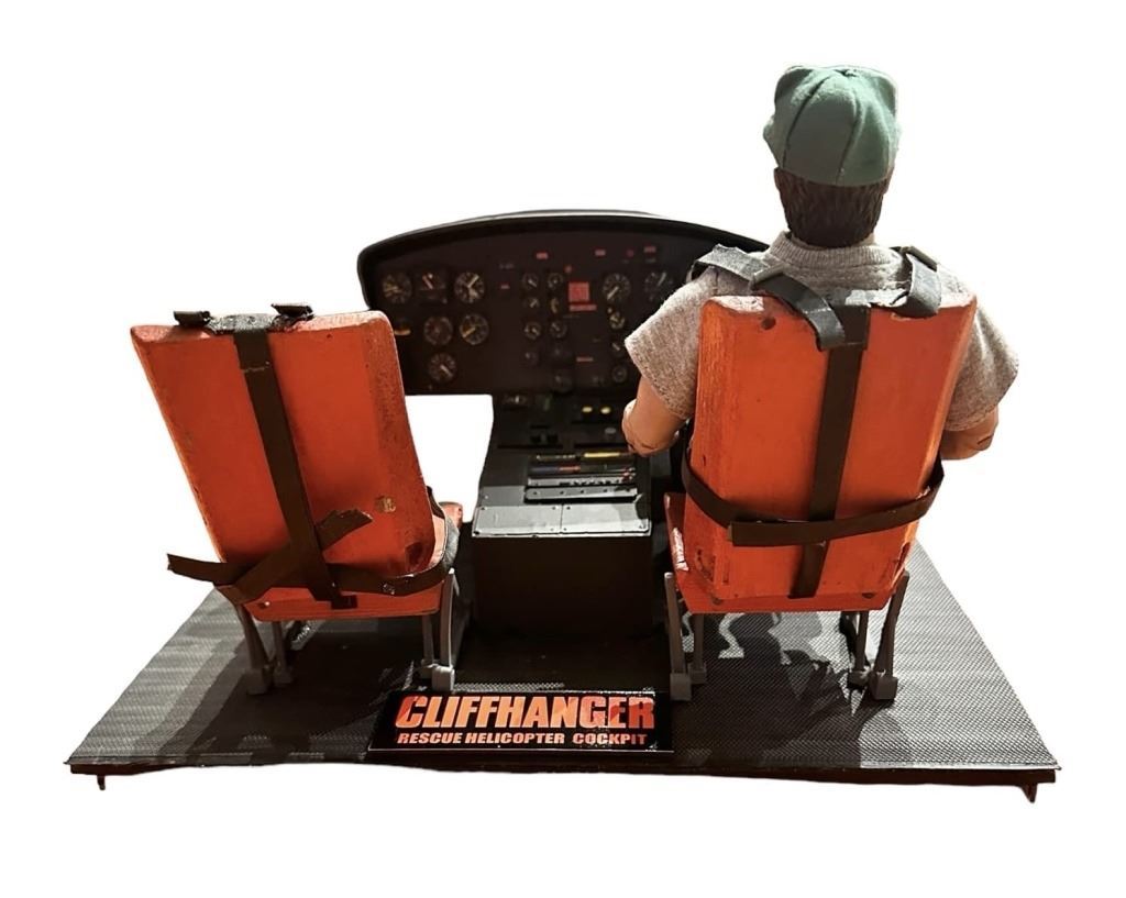 Original Helicopter Cockpit & Sylvester Stallone Miniatures used in the production of the Renny Harlin created action thriller film 'Cliffhanger' (1993), which follows Gabe (Stallone), a mountain climber who becomes embroiled in a heist of a U.S. Treasury plane flying through the Rocky Mountains.