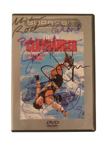 The DVD to the Renny Harlin, Stallone starring Rocky Mountain thriller "Cliffhanger", personally autographed by the cast. The signatures include Sylvester Stallone, Michael Rooker, Caroline Goodall, Paul Winfield, Ralph Waite, Michelle Joyner, Denis Forest, John Lithgow and Craig Fairbrass and many more!