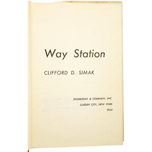 <B>Clifford D. Simak: Review Copy of <I>Way Station</B></I>.</B></I> (New York: Doubleday & Company, 1963), first edition, 210 pages, jacket design by Ronald Fratell, tan cloth with black titles, 8vo (5.75" x 8.5"), dust jacket. Publisher's review stamp on the front pastedown. <I>Way Station,</B></I> winner of the 1964 Hugo Award, is Number 39 on David Pringle's list of 100 Best Science Fiction novels. The book is in very good condition in a very good unclipped dust jacket.<BR><BR><b>Shipping:</b> Books & Catalogs (<a target="_blank" href="http://www.heritageauctions.com/common/shipping.php">view shipping information</a>)