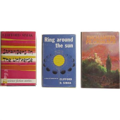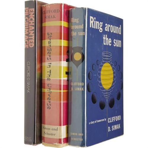 <B>Clifford D. Simak: Three First Editions.</B></I> Includes the following:<BR><B><I>Enchanted Pilgrimage.</B></I></B></I> (New York: Berkley Publishing, 1975), first edition, 218 pages, red boards, 8vo, dust jacket. Condition (book/ dj): very good/ good.<BR><B><I>Ring Around the Sun.</B></I></B></I> (New York: Simon and Schuster, 1953), first edition, 242 pages, yellow boards, 8vo, dust jacket. Condition (book/ dj): good/ good.<BR><B><I>Strangers in the Universe.</B></I></B></I> (New York: Simon and Schuster, 1956), first edition, 371 pages, light yellow on blue boards, 8vo, dust jacket. Condition (book/ dj): good/ good.<BR><BR><b>Shipping:</b> Books & Catalogs (<a target="_blank" href="http://www.heritageauctions.com/common/shipping.php">view shipping information</a>)