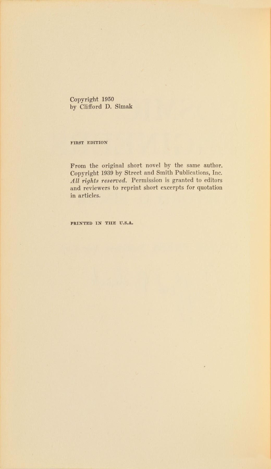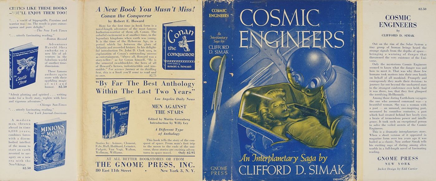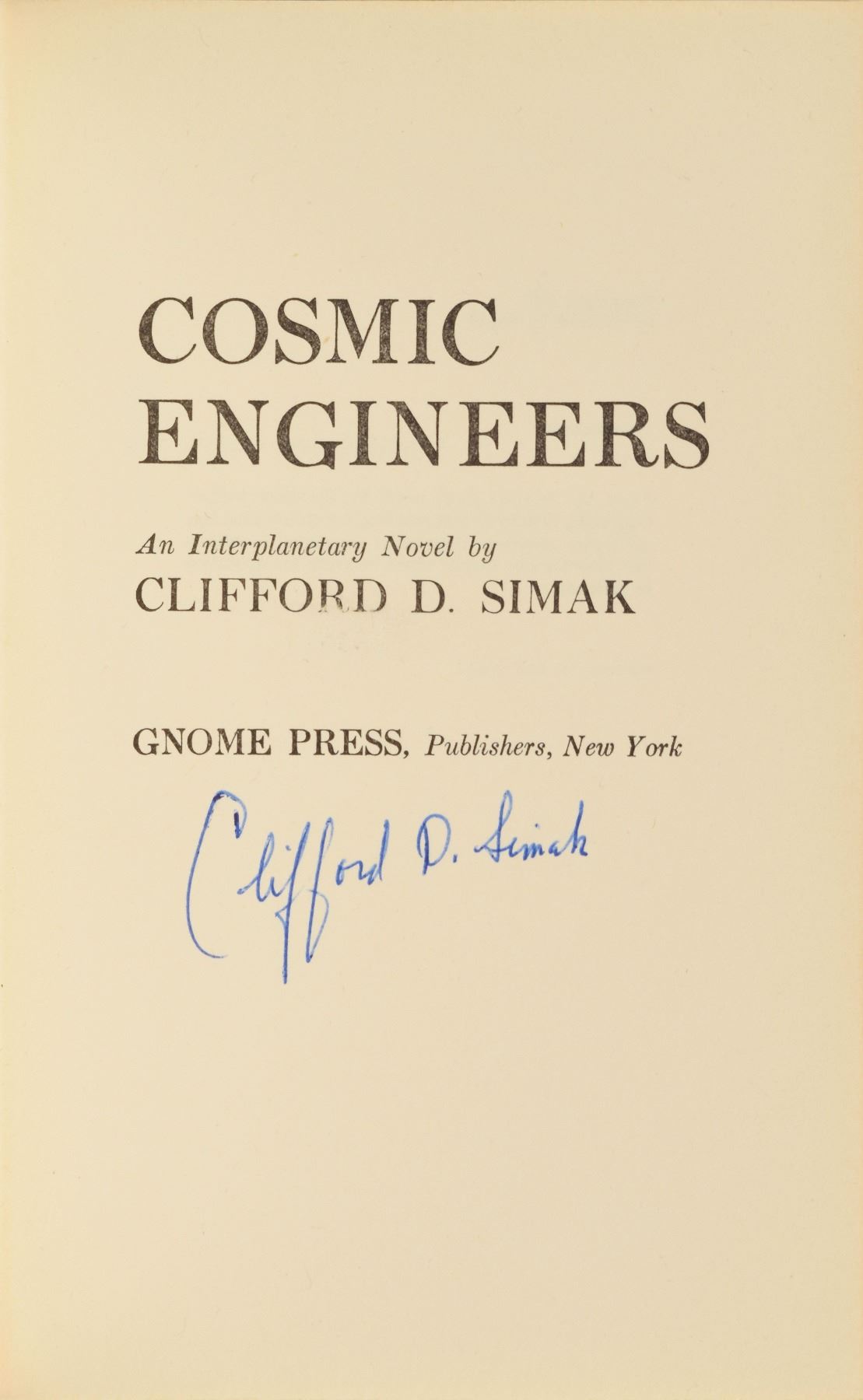 Signed book: Cosmic Engineers. First edition. NY: Gnome Press, 1950. Hardcover with dust jacket, 5.75 x 8.25, 224 pages. Signed on the title page in blue ballpoint, "Clifford D. Simak." Autographic condition: fine. Book condition: VG/VG.