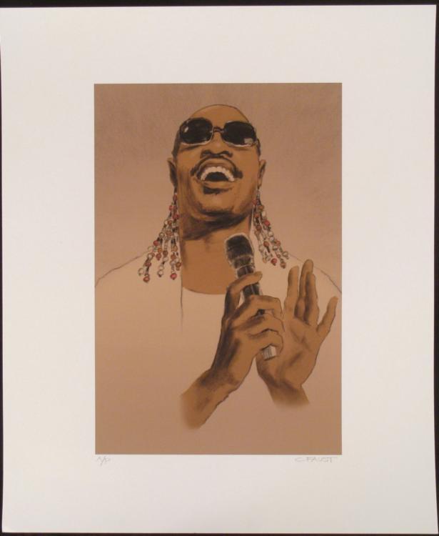 Stevie Wonder has always brought bright emotional projection from his music, and this artwork captures him on a high note. Artist: Clifford Faust Title: Stevie Wonder Signature: In pencil, "C FAUST," lower right Edition: Artist Proof, marked AP, lower left Medium: Print on paper Sheet size: 13 7/8 x 17 inches Condition: Excellent Biography: Clifford Faust attended the School of Visual Arts in New York City, where he now calls home. There he developed his original, mixed media, cut paper creations. Drawing influence from the French Impressionists, Van Gogh, Gustav Klimt, and Egon Schiele, Faust created his own unique style.Clifford has worked in the New York advertising world, and illustrated book covers for publishers in the U.S. and Canada. He has often exhibited at NY Society of Illustrator's annual shows, and is widely collected. For International shipping please request a SHIPPING QUOTE Shipping and handling for this item is $9.50 plus additional insurance cost. For shipping information please see our artwork shipping table for unframed: 3" x 30" tubes on our aboutme page . See over 2,000 art, antique & collectible items on our eBay Store, by clicking here! Like this item? See similar ebay items by clicking here! CLICK THE IMAGE TO ENLARGE Listed with Midwest Estate Buyer's Auction Management System ™ AMS™