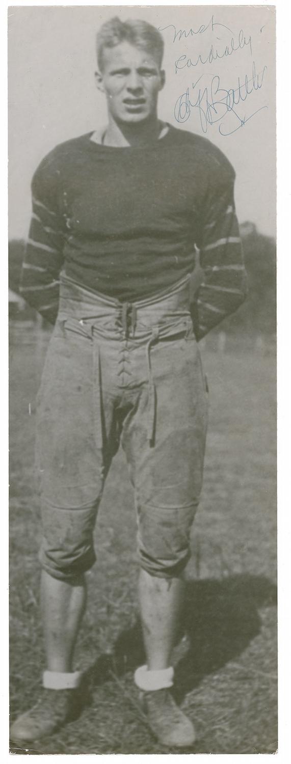 College and Pro Football Hall of Famer (1910–1981). Vintage glossy 5 x 13.75 photo of Battles in his football uniform, later signed in blue ballpoint. “Most cordially, Cliff Battles.” Scattered creasing with a creased top left corner, surface marks, a few scratches, and trimmed edges, otherwise fine condition.
