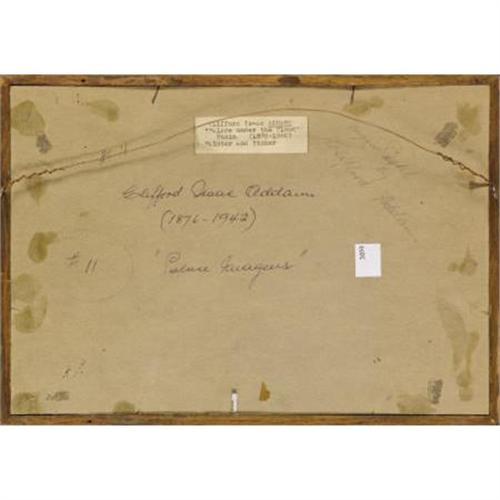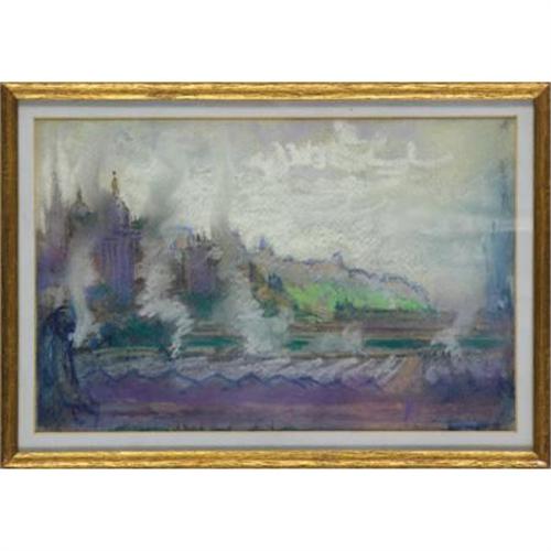 <B>CLIFFORD ISAAC ADDAMS (American, 1876-1942)</B></I><BR><I>Palace Under the Clouds</B></I><BR>Pastel on green-grey paper<BR>7-1/2 x 11 inches (19.1 x 27.9 cm)<BR>Initialed upper right: <I>A</B></I><BR>Signature severely smudged lower right: <I>C. Addams</B></I><BR> <BR>Inscribed in pencil on verso:<I> Original pastel by Clifford Addams</B></I><B>Condition Report:</B> Pin holes in upper left and right corners, framed.<BR><BR><b>Shipping:</b> Framed - with Glass, Small (<a target="_blank" href="http://www.heritageauctions.com/common/shipping.php">view shipping information</a>)
