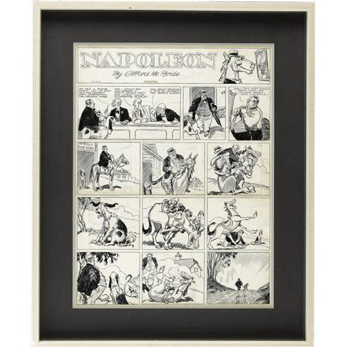 <B>Clifford McBride - Napoleon Sunday Comic Strip Original Art, dated 9-29-35 (Arthur J. Lafave, 1935).</B></I> <I>Napoleon</B></I> fans will love this brilliantly executed, mostly pantomime gag featuring a horse that goes into hysterics upon seeing the riding costume of Uncle Elby. Clifford McBride's canine creation, Napoleon, was tiny Cleveland-based syndicate Arthur J. Lafave's biggest star, and it's no wonder why. Always stylishly drawn in fine-line pen and ink, Napoleon was never-the-less a big, goofy hound whose comic expressions were always rib-tickling. The page is composed of carefully done original art paste-ups on a larger support paper, and it also has a number of blue-pencil marks denoting color to be added by the engravers. This Sunday is in otherwise Excellent condition, with an image area measuring approximately 16.5" x 22". <I>From the Estate of Bruce Hamilton.</B></I> <BR><BR><B>Important notice:</B> Heritage usually auctions material at the rate of 200-250 lots per hour. On some occasions eBay Live bid software or the Internet may not be able to keep up with the pace of the auction. We recommend placing a realistic absentee bid now as insurance to avoid disappointment. Occasionally the auctioneer may eliminate or reject an eBay Live bid, and the auctioneer may also reopen a lot after the close of the eBay live bidding (usually because we missed an audience bid), and may reject your bid even if it shows you as the winning bidder. By bidding via eBay Live, you agree that Heritage may award the lot to another bidder at its sole discretion under the circumstances described above or any other reasonable circumstances. Since eBay bids are not shown to us until we open the lot on the floor, we treat those bids just like floor bids. In most cases the floor responds before the eBay bid is presented to us, due to Internet lag time, so for consistency we have made it a policy that floor bids are always considered first over tie eBay live bids. Also please note that all Heritage lots purchased through eBay Live carry a 22.5% Buyer's Premium. Please make sure you read the Terms and Conditions before you bid. This lot is being auctioned in conjunction with a live floor auction by Heritage Auction Galleries. All final auction and invoice information will be supplied by Heritage Auction Galleries, and all other information should be considered preliminary. Lot:41001 <BR><BR><B>Winning Notification and Billing:</B> After the FINAL session in this auction is complete, Heritage will send e-mail and snail mail invoices. This process normally takes several days. All final auction and invoice information will be supplied by Heritage Auction Galleries, and all other information should be considered preliminary. <BR><BR>This auction will be conducted on a live auction floor and over the Internet through eBay Live. If you choose to place an absentee bid, please take a moment to <font color='#0000ff'><u><a href='http://pages.ebay.com/liveauctions/help/before/laabsentee.html'>learn how eBay Live absentee bidding works</a></u></font><font color='#000000'>