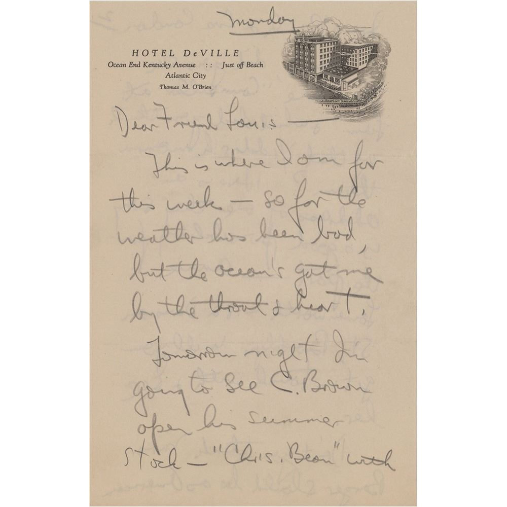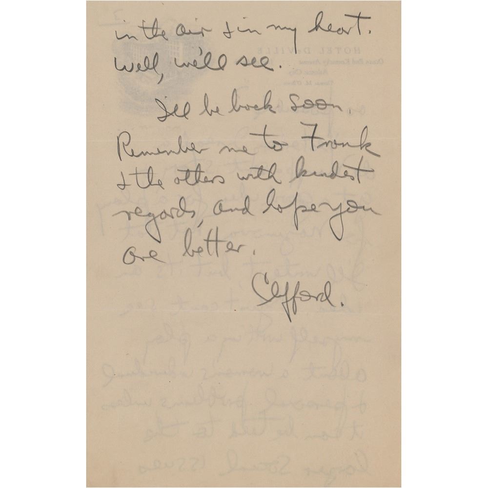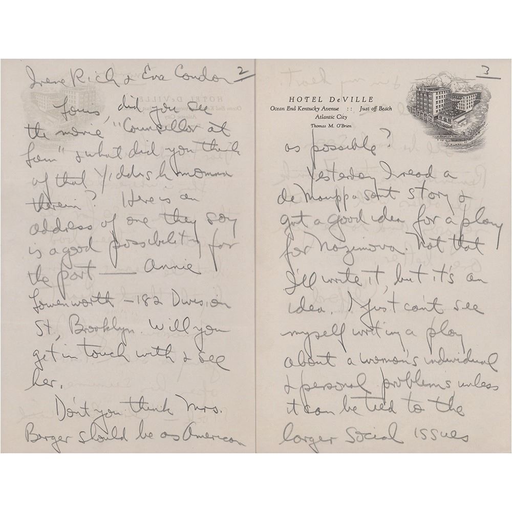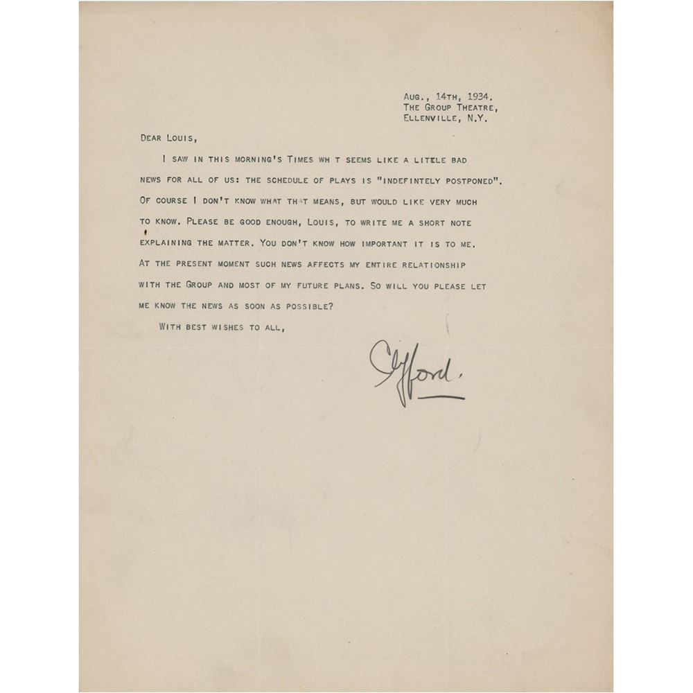 Two TLSs and one ALS in pencil, each signed “Clifford,†six total pages, each addressed to “Louis,†with the two typed letters dating to August 8 and 14, 1934. The ALS, no date, written on Hotel DeVille stationery, in part: “Yesterday I read a de Maupassant story & got a good idea for a play for Nazimova. Not that I’ll write it, but it’s an idea. I just can’t see myself writing a play about a woman’s individual & personal problems unless it can be tied to the larger social issues in the air & in my heartâ€; the earlier TLS, which Odets begins by listing the address for The Group Theatre, in part: “About ‘Awake and Sing!,’ please let me know when you begin to stir on it. I want to look over the people with you…I feel about it like a first baby. But not worried. I think we should hit the dear public in the face with it like a tear bombâ€; and the second TLS, finds Odets requesting news on why the play schedule has been “indefinitely postponedâ€â€”“At the present moment such news affects my entire relationship with the Group and most of my future plans.†In overall very good to fine condition.