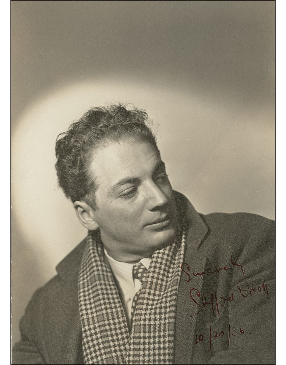 American playwright (1906–1963) known for his powerful works of the Depression era, including Waiting for Lefty and Golden Boy. Vintage matte-finish 4 x 5.75 proof photo, signed in red fountain pen, “Sincerely, Clifford Odets, 10/20/36.” Photo is stamped on reverse, “Proof Property of Alfredo Valente.” Moderate contrast to signature and sentiment and a bit of light discoloration to background, otherwise fine condition.