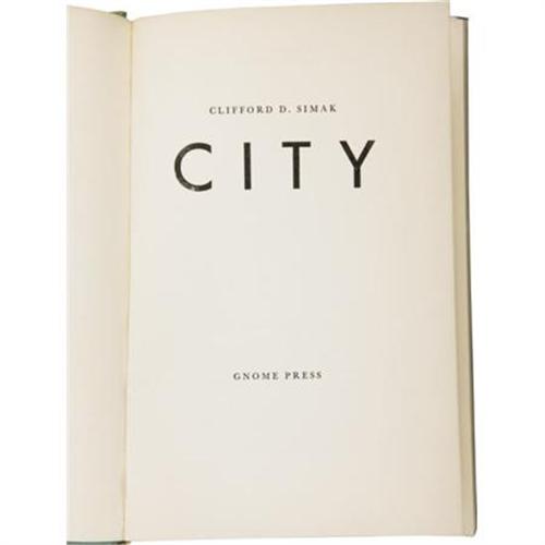 <B>Clifford Simak: <I>City</B></I></B></I> (New York: Gnome Press, 1952), first edition, 224 pages, blue-green cloth with dark blue lettering on spine, 8vo (5.5" x 8.25"), dust jacket (in protective Mylar). Jacket illustration by Frank Kelly Freas. One of 5,000 copies printed of this wonderful first edition in which dogs pass down a series of oral legends of the mythological creature Man. The copy presented here is very good with minor wear to the edges, corners, and spine. The dust jacket is about fine, with some minor wear at the corners, spine, and along the rear panel, but it is vibrant. This 1953 International Fantasy Award Winner is scarce in this condition.<BR><BR><b>Shipping:</b> Books & Catalogs (<a target="_blank" href="http://www.heritageauctions.com/common/shipping.php">view shipping information</a>)