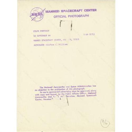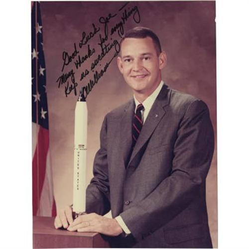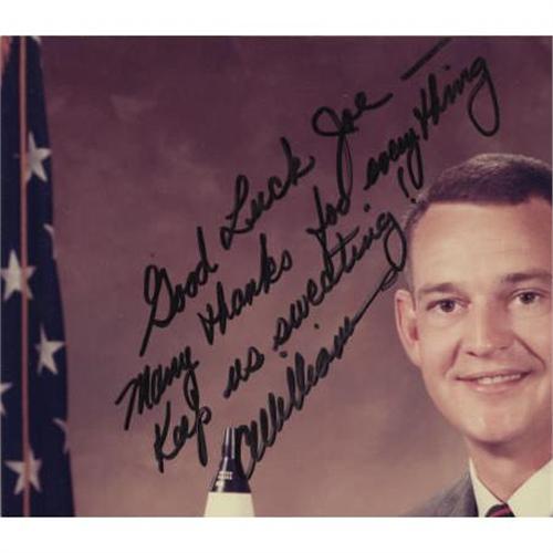 <B>Clifton C. Williams Signed Color Photograph,</B></I> 7.25" x 9.5", "<I>Good Luck Joe -/ Many thanks for everything/ Keep us sweating!/ C. Williams.</B></I>" Williams was one of the third group of astronauts named by NASA in 1963. He served as backup pilot for Gemini 10 (1966). Major Williams was killed on October 5, 1967, near Tallahassee, Florida, in the crash of a T-38 jet. Slight nick at upper right edge. Mounting traces on verso. Autographs of Williams are rare in any form. <I>From the collection of renowned former physical trainer of the astronauts Joe Garino. This lot is accompanied by a signed certificate of authentication from Garino verifying its provenance.</B></I> <BR><BR><b>Shipping:</b> Flat Material, Small (<a target="_blank" href="http://www.heritageauctions.com/common/shipping.php">view shipping information</a>)