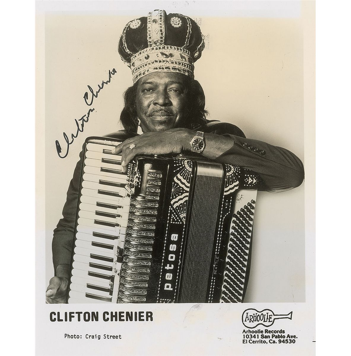 Accordion player (1925–1987) of the ‘zydeco’ genre, a fusion of Cajun and blues music. Glossy 8 x 10 Arhoolie Records publicity photo of Chenier posing with his accordion and wearing a crown, signed in black felt tip. In fine condition, with light toning and a few surface marks.