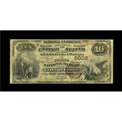<B>Clifton Forge, VA</B></I> - $10 1882 Brown Back Fr. 490 <B>The First NB</B></I> Ch. # 6008<BR>While the census from here stands at a seemingly available 20 notes in Large Size, just one $10 Brown Back was previously documented. Tonight's offering is the second. While a well circulated <B>Good-Very Good,</B></I> it retains the original officers' signatures and other than considerable wrinkling and circulation soiling consistent with the assigned grade, it is quite presentable considering its obvious experience.<BR><I>From The George P. Hammerly Collection</B></I><BR><BR><b>Shipping:</b> Coin/Currency (<a target="_blank" href="http://www.heritageauctions.com/common/shipping.php">view shipping information</a>)
