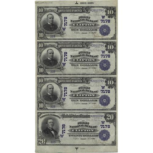 <B>Clifton, KS</B></I> - $10-$10-$10-$20 1902 Date Back Fr. 616/642 <B>The First NB </B></I>Ch. # (W)7178 Uncut Sheet<BR> This is a nice Blue Seal Date Back uncut sheet. There is a lateral fold at the center of the sheet, and a few light bends, but the embossing is still evident. <B>Crisp Uncirculated</B></I>.<BR><I>From The J.S. Weber Collection.</B></I><BR><BR><b>Shipping:</b> Coins & Currency (<a target="_blank" href="http://www.heritageauctions.com/common/shipping.php">view shipping information</a>)