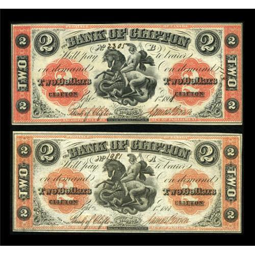 <B>Clifton, PC- Bank of Clifton</B></I> $2 (2) Sept. 1, 1861 Ch. # 125-12-10, 125-12-12<BR> A pair of the 1861 twos, one with the written "1" written over the date, the second with the date fully engraved. Both are <B>Uncirculated.</B></I><BR><I>From The Thomas M. Flynn Collection</B></I><BR><BR><b>Shipping:</b> Coins & Currency (<a target="_blank" href="http://www.heritageauctions.com/common/shipping.php">view shipping information</a>)