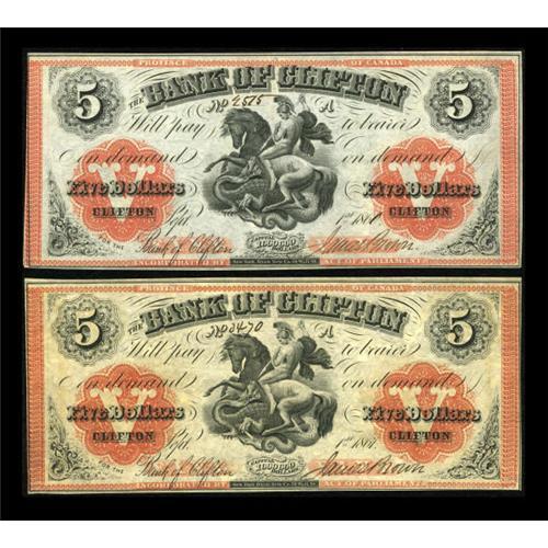<B>Clifton, PC- Bank of Clifton</B></I> $5 (2) Sept. 1, 1861 Ch. # 125-12-16, 125-12-18<BR> Two examples of the highest denomination issued by this bank. <B>Uncirculated.</B></I><BR><I>From The Thomas M. Flynn Collection</B></I><BR><BR><b>Shipping:</b> Coins & Currency (<a target="_blank" href="http://www.heritageauctions.com/common/shipping.php">view shipping information</a>)