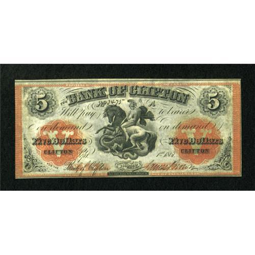 <B>Clifton, PC- The Bank of Clifton</B></I> $5 Sept. 1, 1861 Ch. # 125-12-18<BR> The colors have remained bright on this note that has been cut a bit tight along the left side. <B>Crisp Uncirculated</B></I>.<BR><BR><b>Shipping:</b> Coins & Currency (<a target="_blank" href="http://www.heritageauctions.com/common/shipping.php">view shipping information</a>)