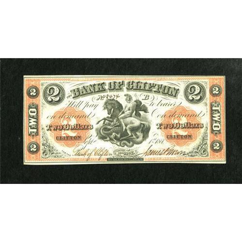 <B>Clifton, Province of Canada- Bank of Clifton</B></I> $2 Sep. 1, 1861 Charlton 125-12-12<BR> This Canadian chartered bank failed in 1863. <B>Choice Crisp Uncirculated.</B></I><BR><BR><b>Shipping:</b> Coins & Currency (<a target="_blank" href="http://www.heritageauctions.com/common/shipping.php">view shipping information</a>)