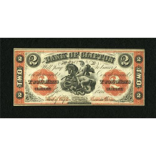 <B>Clifton, Province of Canada</B></I>- Bank of Clifton $2 Sep. 1, 1861 Charlton 125-12-12<BR> This is a pleasing <B>Very Fine-Extremely Fine</B></I> that exhibits a few pinholes on well inked surfaces.<BR><BR><b>Shipping:</b> Coins & Currency (<a target="_blank" href="http://www.heritageauctions.com/common/shipping.php">view shipping information</a>)