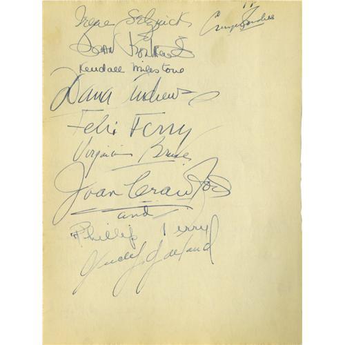 <B>Clifton Webb Autograph Collection.</B></I> An incredible two-sided page of signatures from the guest book of Clifton Webb and his mother Mabel, in which the highlight is a beautiful green-ink signature of Judy Garland. Dated June 17, 1944, and marked as "Party for Elsa" (Maxwell, presumably), the Garland signature literally comes at the very end of a remarkable collection of Who's Who in Hollywood signatures - including Joan Crawford, Jack L. Warner, Darryl F. Zanuck, Basil Rathbone (and his wife Ouida), Otto Preminger, Edmund Goulding, Oleg Cassini, Dana Andrews, Virginia Bruce, George Sanders, Irene Selznick, Gilbert Roland, Judith Anderson, Phillip Terry (then married to Crawford), Jean Feldman and more. An incredible collection of Hollywood history on a single sheet of paper! <I>With COA from PSA/DNA.</B></I>