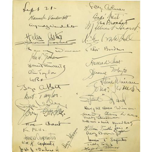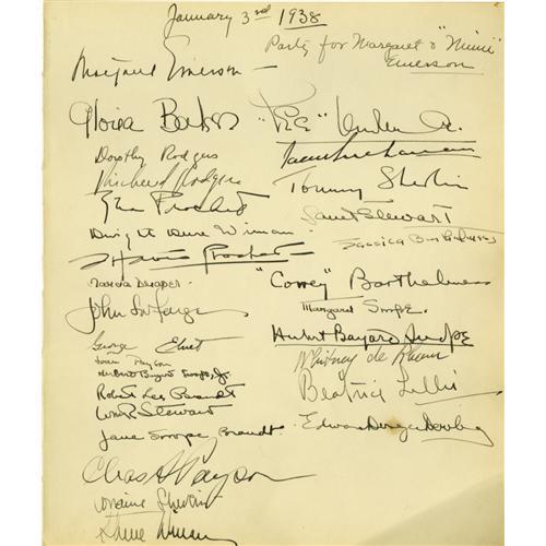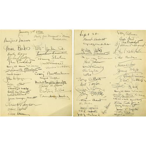 <B>Clifton Webb Signed Guest Book Pages.</B></I> A two-page lot of signatures from the guest book of Webb and his mother Mabel. Sheet one is perhaps most notable for the signature of Richard Barthelmess (1895-1963). "He had the most beautiful face of any man who ever went before the camera," said Lillian Gish, who joined Barthelmess acting for D.W.Griffith in <I>Broken Blossoms</B></I> (1919) and <I>Way Down East</B></I> (1940), which featured the classic scene of Barthelmess leaping across the racing ice floes to save the imperiled Gish. Primarily a star in Silents, Barthelmess still scored in films such as <I>The Dawn Patrol</B></I> (1930), and signed this page using his nickname, writing "Corey Barthelmess." His wife Jessica has signed it too, as have such celebrities as Beatrice Lillie and Richard Rodgers. The second page, dated Sept. 21 (no year) famed theatre director George Abbott, Broadway musical star Libby Holman and Millicent Hearst, wife of William Randolph Hearst. A fine assortment of vintage signatures. <I>With COA from PSA/DNA.</B></I>