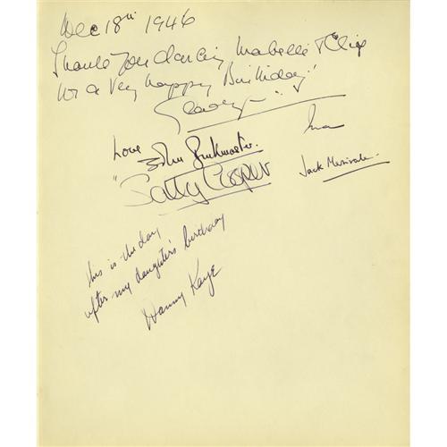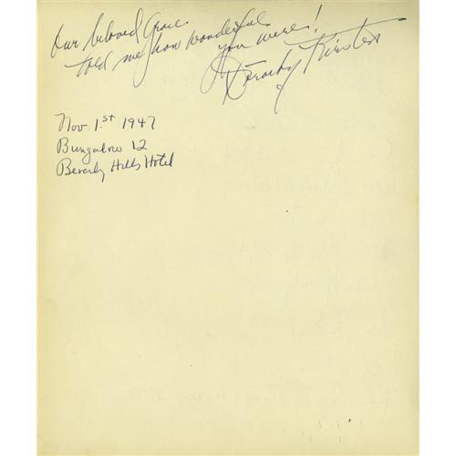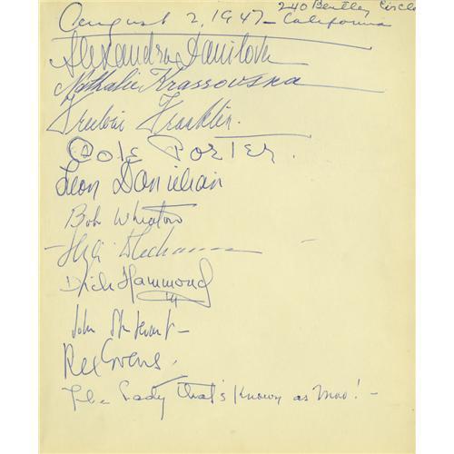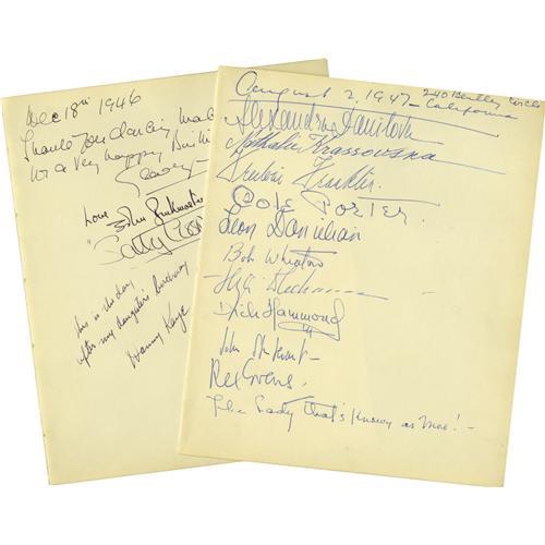<B>The Webbs Entertain On Bentley Circle.</B></I> Cole Porter's signature is distinctive in this first page, dated August 2, 1947, at Webb's home, 240 Bentley Circle in California on one of two pages from the guest books of Webb and his mother Mabel. Also featured: the very rare autograph of Rex Evans, whom horror fans might remember as the raving villager "Vazec," who blows up the dam in <I>Frankenstein Meets the Wolf Man.</B></I> The reverse has the autograph of opera star Dorothy Kirsten, who later appeared in the 1951 film <I>The Great Caruso.</B></I> The second page, dated December 18, 1946, has the autograph of Danny Kaye, then a major attraction for Samuel Goldwyn, who's noted, "This is the day after my daughter's birthday." Nice variety. <I>With COA from PSA/DNA.</B></I>
