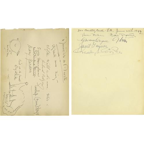 <B>The Webbs Host Varied Guests.</B></I> Two sheets from the guest books of Clifton Webb and his mother Mabel. Page one (undated) offers a real curio - the dramatic signature of Mercedes de Acosta, whose name will be familiar to anyone acquainted with the legend and lore of Greta Garbo. Other signers include Somerset Maughm (who signed "Syrie Maughm"), Evelyn Laye (who added the word "Boo" between her first and last name) and Mary Gordon, who was drowned by Karloff's Monster in <I>Bride of Frankenstein</B></I> and later played Mrs. Hudson, the housekeeper in Basil Rathbone's Sherlock Holmes film series. The sheet features a cartoon of a dinosaur and a chicken (?), the latter apparently drawn by Elsa Maxwell, who has signed her first name. Sheet two, dated June 23, 1947 at 240 Bentley Circle in Los Angeles, features Janet Gaynor, Adrian, Theresa Helburn and Laurence Langner (directors of the Theatre Guild), and Cole Porter. Clifton's friends were wide-ranging - and an incredibly talented crowd. <I>With COA from PSA/DNA.</B></I>