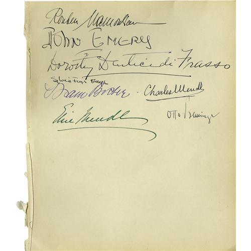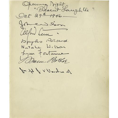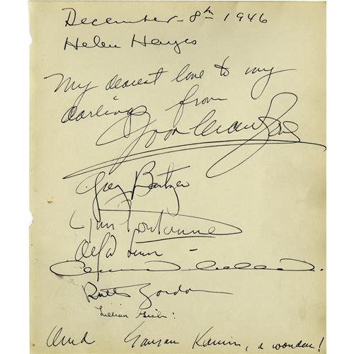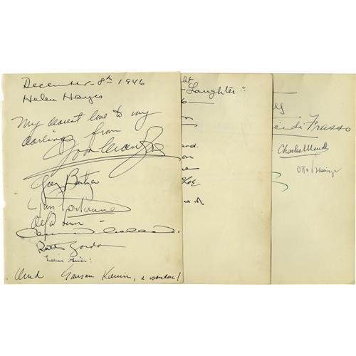 <B>Joan Crawford Visits the Webbs.</B></I> .A three-page lot from Clifton Webb's stellar social life crowd of the late 1940s. The December 8, 1946 guest book page is dominated by the sweeping full signature of Joan Crawford, who'd recently won the Oscar for <I>Mildred Pierce</B></I> (1945). "My dearest love to my darlings from Joan Crawford," she wrote. Her lawyer beau Greg Bautzer signed below her name. Among the other luminaries who autographed this page: Helen Hayes, Alfred Lunt and Lynn Fontanne, Lillian Gish, Ruth Gordon and Garson Kanin. Page two is dated October 29, 1946, and is from the Opening Night party for Noel Coward's play <I>Present Laughter,</B></I> which was Webb's final Broadway play . Among the signers on the front side are Alfred Lunt and Lynne Fontanne; the back side has the boldly flamboyant signature of Tyrone Power, dated November 17, 1946, and features a cartoon of a cigarette-smoking devil, apparently related to Sartre's play <I>No Exit,</B></I> which was then about to open on Broadway. The undated page three has the signatures of Rouben Mamoulian, Otto Preminger, John Emery, Sylvia Fine Kaye and the Countess di Frasso. Webb should have written his memoirs! <I>With COA from PSA/DNA.</B></I>