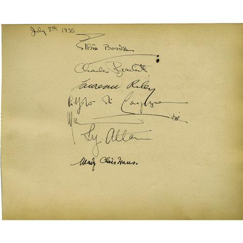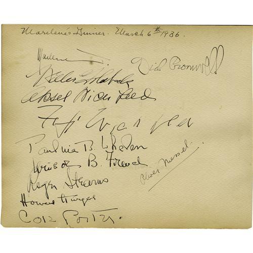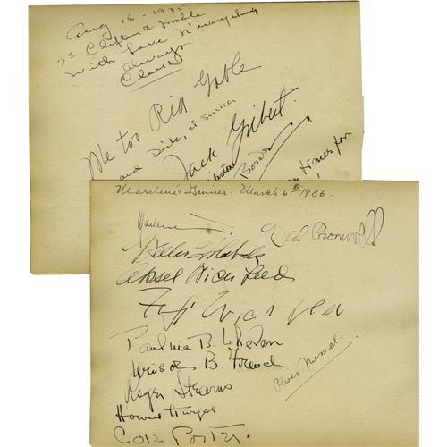 <B>Clark Gable Pays a Visit to the Webbs.</B></I> Clark Gable has recently won the Academy award for <I>It Happened One Night</B></I> and was soon to be sen in <I>Mutiny on the Bounty</B></I> when his autograph topped the page at an August 18, 1935 Clifton Webb party. Webb, after the Broadway hit <I>As Thousands Cheer,</B></I> had come west wit his mother Mabel and had settled in Brentwood, California. Gable wrote in their book, "To Clifton and Mabel - With Love N'everything - Always Clark." Gable's 17-years-older wife wrote "Me too Ria Gable" below her husband's name; the page is also signed by Mr. and Mrs. Richard Barthelmess ("Dick & Jessica"), actress Mady Christians, and John Gilbert - the "Talkies" greatest casualty, who signed "Jack Gilbert" and who died less than five months later. The verso, dated July 31, 1935 and also signed at the Webb's Brentwood home, is a treasure of Golden Age autographs - Ronald Colman, Basil Rathbone and his wife Ouida, Frank Lawton (the grown David of <I>David Copperfield</B></I>) and his noted British actress wife Evelyn Laye-Lawton, Constance Collier, directors Rouben Mamoulian, Edmund Goulding and George Cukor, designer Oliver Messel and more. Sheet two in this lot is dated March 6, 1936 and headed as "Marlene's Dinner." Yes, it was that Marlene, whose signed first name tops an autograph list including actor Richard Cromwell, composer Cole Porter and a gentleman named Howard Hughes. And the verso of this page, dated July 17, 1935, bears the autographs of writer Charles Brackett, as well as, once again, "Marlene" - along with "Liz Allan," aka Elizabeth Allan, MGM star who was Marlene's protegee in 1935. A remarkable collection of autographs from a variety of Hollywood's greatest stars, all of whom were then at their personal apex. <I>With COA from PSA/DNA.</B></I>