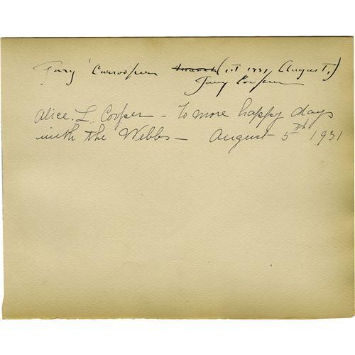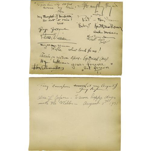<B>Clifton Webb Autographs.</B></I> Two pages from the guest books of Clifton Webb and his mother Mabel. Prominent on the first page is the large ink signature of Humphrey Bogart. The page is undated, but the reverse is dated December 15, 1936, which indicates Bogart signed this page after his first year at Warner Bros., where he reprised his Broadway role of "Duke Mantee" in <I>The Petrified Forest</B></I> and carried on his big parade of gangsters in films such as <I>Bullets and Ballots.</B></I> His second wife, actress Mary Philips, has signed the page as "Mary Bogart" and the page also features Kay Francis (who adds "Pet" beside her name), actor Don Alvarado and socialite Elsa Maxwell. The second included page, dated August 5, 1931, features an excellent signature by Gary Cooper, who visited the Webbs with his mother, Alice Cooper. She also signed the book ("To more happy days with the Webbs"). Two screen superstars available in this one lot! <I>With COA from PSA/DNA.</B></I>