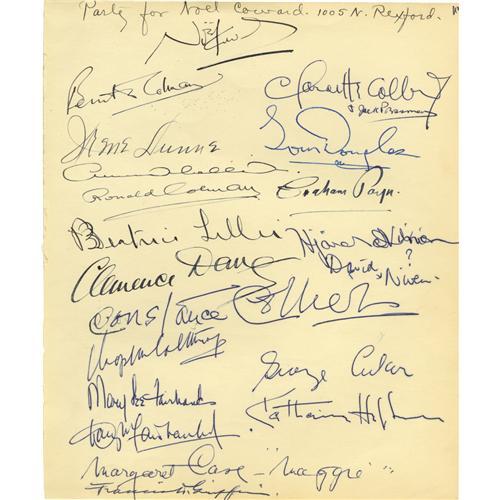 <B>Clifton Webb Celeb-Signed Guestbook Page.</B></I> A page from a guestbook owned by Clifton Webb, labelled "Party for Noel Coward, 1005 N. Rexford" at the top in Webb's hand. The selection of big, bold signatures includes Claudette Colbert, Ronald Colman, Irene Dunne, David Niven, Constance Collier, George Cukor, Katharine Hepburn, Douglas Fairbanks Jr. and his wife Mary Lee, and, of course, Noel Coward. The page is in Very FIne to Excellent condition with mild overall tanning and a little bit of edge wear. <I>From the Clifton Webb estate.</B></I><I>Accompanied by LOA from PSA/DNA.</B></I><BR><BR><b>Shipping:</b> Other (oversized items, group lo (<a target="_blank" href="http://www.heritageauctions.com/common/shipping.php">view shipping information</a>)
