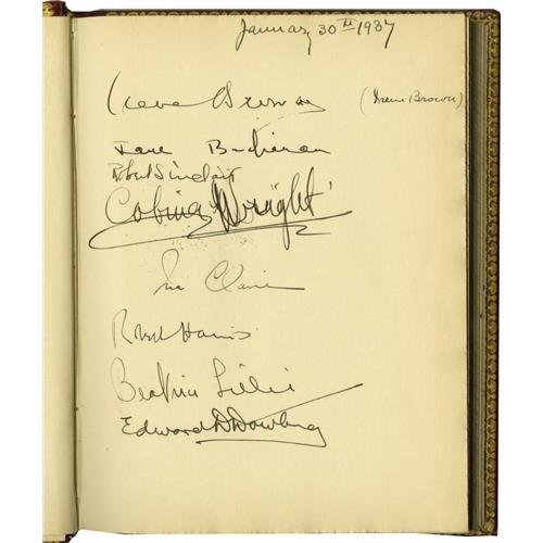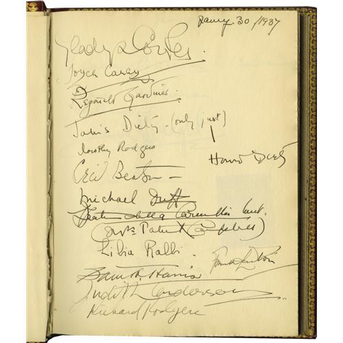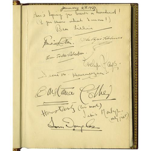 <B>Clifton Webb Guest Book - "Mother Her Book."</B></I> Clifton Webb's life-long devotion to his mother Maybelle was legendary, and this was her personal volume, with "Mother Her Book" engraved on the front of the 7" x 9.5" red and gold album. The signatures date from the late 1930s to the early 1940s, and include Noel Coward, Bea Lillie, Richard Rodgers, Judith Anderson, Elsa Maxwell, Ina Claire, Cecil Beaton, Charles MacArthur, Phillips Holmes, Frank Lawton, Evelyn Laye, Cobina Wright, Mercedes de Acosta, Martin Kosleck, Gladys Swarthout, Grace Moore, Reginald Gardiner Libby Holman, Constance Collier, Ruth Donnelly, and more. In Excellent condition.<I>Accompanied by LOA from PSA/DNA.</B></I><BR><BR><b>Shipping:</b> Books & Catalogs (<a target="_blank" href="http://www.heritageauctions.com/common/shipping.php">view shipping information</a>)