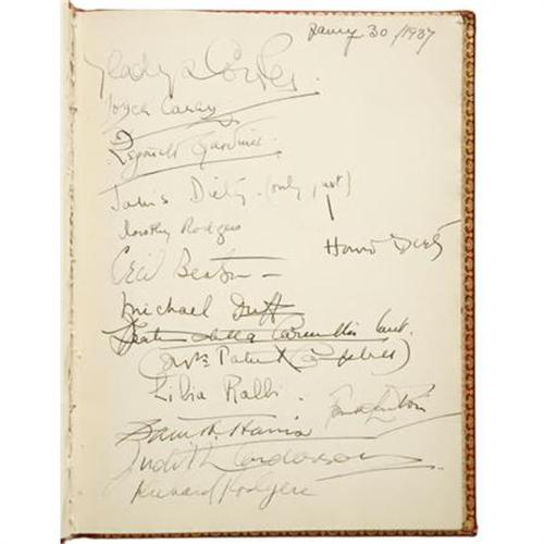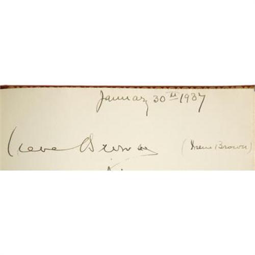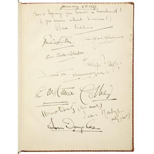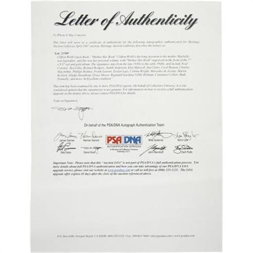 <B>Clifton Webb Guest Book - "Mother Her Book."</B></I> Clifton Webb's lifelong devotion to his mother Maybelle was legendary (after her passing, Noel Coward quipped to Webb: "It must be difficult to be orphaned at seventy, Clifton."). This red-and-gold volume was her personal scrapbook, and is engraved"Mother Her Book" on the front cover. The signatures date from the late '30s to the early '40s, and include Coward, Bea Lillie, Judith Anderson, Elsa Maxwell, Richard Rodgers, Mercedes de Acosta, Charles MacArthur, Walter Slezak, Ray Bolger, and others.In Fine to Very Fine condition with mild tanning to the pages and some mild wear to the corners and the head and tail of the spine. <I>Accompanied by a COA from PSA/DNA.</B></I><BR><BR><b>Shipping:</b> Books & Catalogs (<a target="_blank" href="http://www.heritageauctions.com/common/shipping.php">view shipping information</a>)