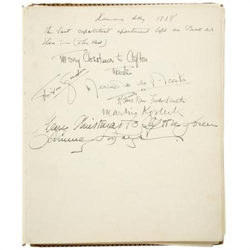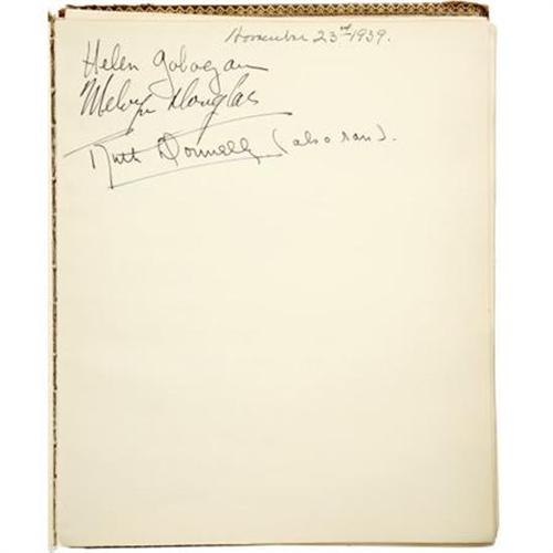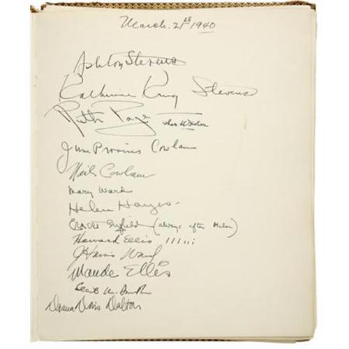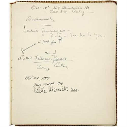 <B>Clifton Webb Guest Book - "The Webbs" - Vintage Star Signatures.</B></I> This handsome 8.5" x 10.5" brown and gold guest book ranges the years 1937 to 1947. Among the rich and/or famous who visited Clifton Webb and his mother and signed this book were Helen Hayes, Charles MacArthur, Melvyn Douglas, Helen Gahagan, George Cukor, Ruth Gordon, Alfred Lunt, Lynn Fontanne, Martin Kosleck, Beatrice Lillie, Mercedes de Acosta, Ina Claire, Gladys Swarthout, Irene Selznick, Gladys Cooper, and fan dancer Sally Rand. In Very Fine condition with some border wear and a few loose pages; the pages themselves are clean and neat. <I>Accompanied by LOA from PSA/DNA.</B></I><BR><BR><b>Shipping:</b> Books & Catalogs (<a target="_blank" href="http://www.heritageauctions.com/common/shipping.php">view shipping information</a>)
