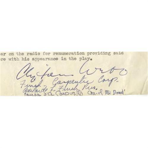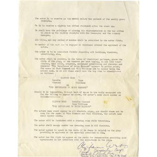 <B>Clifton Webb Signed Contract.</B></I> A single-page agreement, undated, stipulating pay, marquee credits, and other perquisites for a traveling production of <I>The Importance of Being Ernest,</B></I> signed by Webb in blue ink. In Very Fine condition with mild tanning, a small area of discoloration near the right edge, a heavy fold crease, and a small tear to the lower left corner, none of which affect the signature.<BR><BR><b>Shipping:</b> Flat Material, Small (<a target="_blank" href="http://www.heritageauctions.com/common/shipping.php">view shipping information</a>)