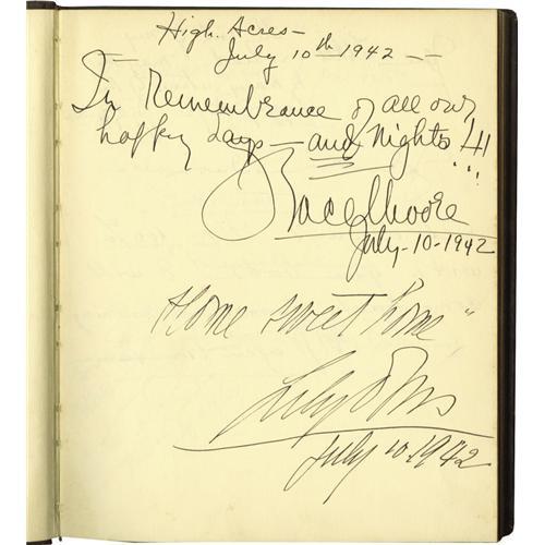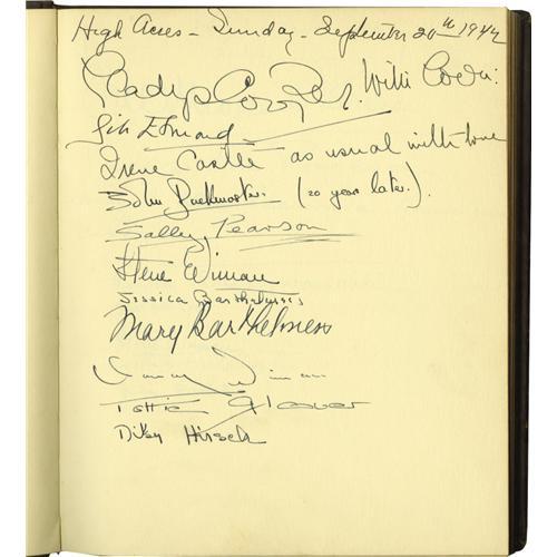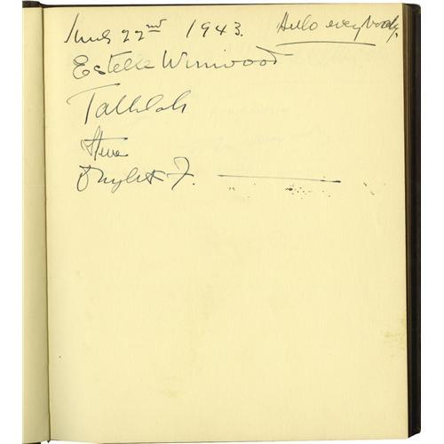 <B>Clifton Webb Signed Guest Book from his Home, Highacres.</B></I> A handsome, brown and gold guest book, approximately 7.5" x 9.5" from Webb's Highacres estate in the east, with signatures from 1942 and 1943. Included are Grace Moore, Gladys Cooper, Constance Collier, Irene Castle, Estelle Winwood, Tallulah Bankhead (signed "Tallulah") and more. Excellent condition.<I>Accompanied by LOA from PSA/DNA.</B></I><BR><BR><b>Shipping:</b> Books & Catalogs (<a target="_blank" href="http://www.heritageauctions.com/common/shipping.php">view shipping information</a>)