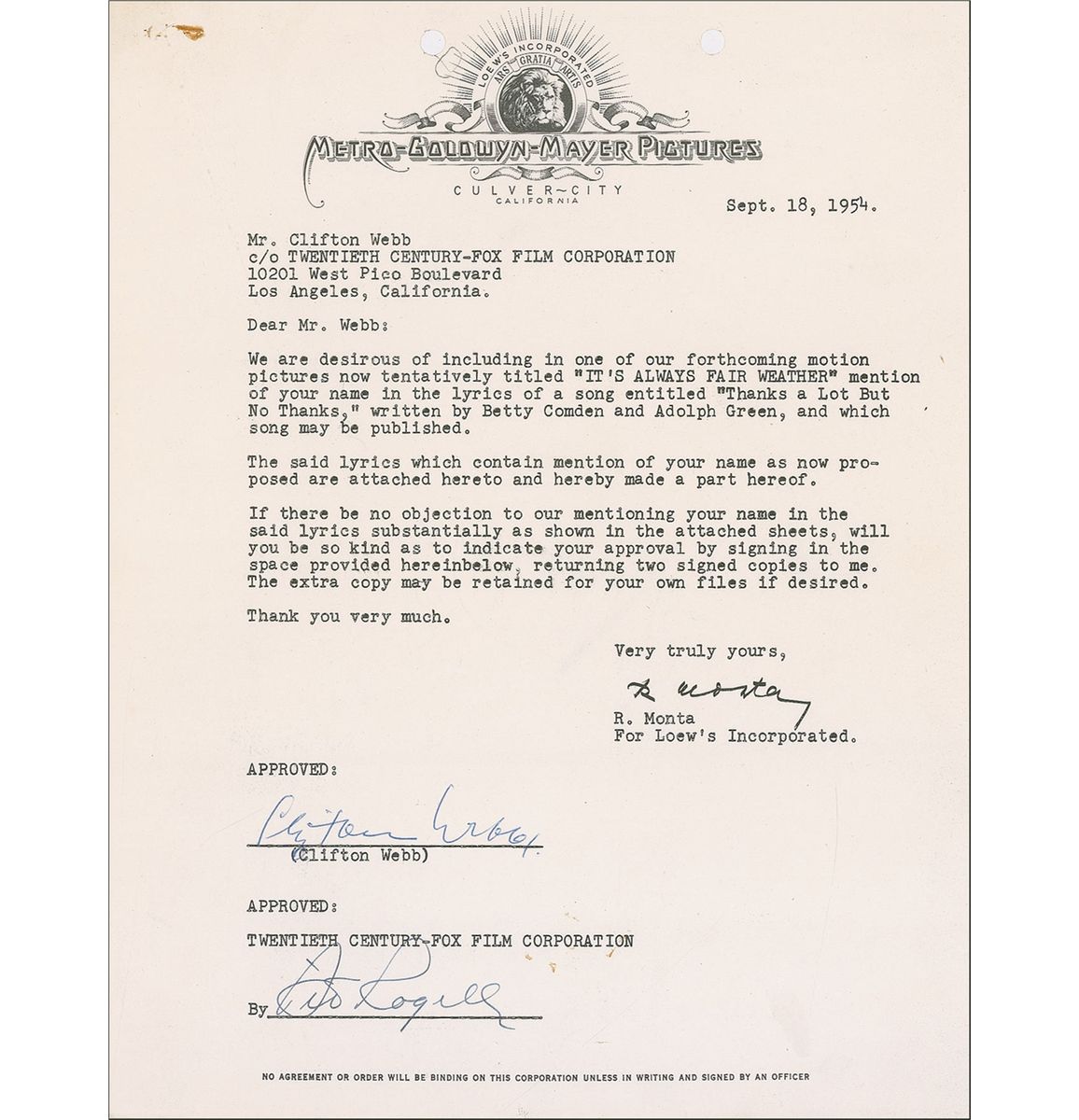DS, one page, 8.5 x 11, September 18, 1954. Request from Metro-Goldwyn-Mayer to Clifton Webb, stating, “We are desirous of including in one of our forthcoming motion pictures now tentatively titled ‘It’s Always Fair Weather’ mention of your name in the lyrics of a song entitled ‘Thanks a Lot But No Thanks,’ written by Betty Comden and Adolph Green, and which song may be published.” A few small rusty spots of soiling towards the bottom of the document, a rusty print and small mark from a previous staple to the top left corner, a few faint paperclip impressions, and two punch holes at the top edge, otherwise fine condition.