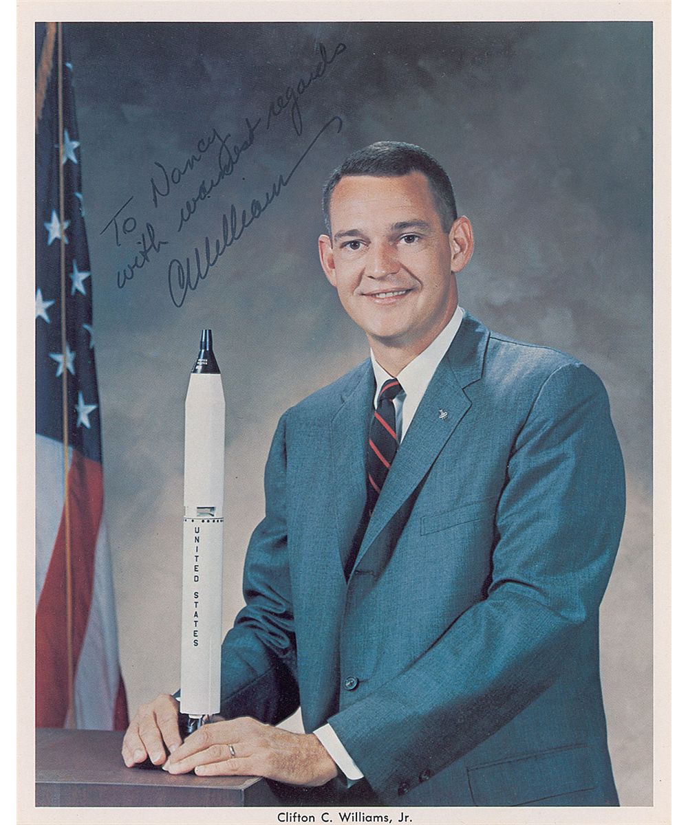Group Three astronaut (1932–1967) who died in a crash of a NASA T-38 jet trainer near Tallahassee, Florida. Color vintage 8 x 10 NASA photo of Williams posing in a jacket and tie with a model rocket, signed and inscribed in black felt tip, “To Nancy, with warmest regards, C. Williams.” In fine condition.
