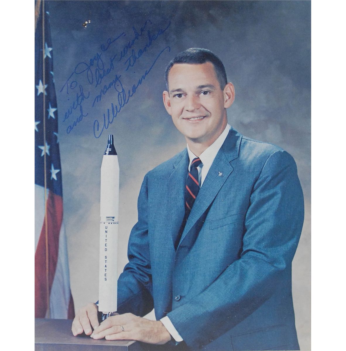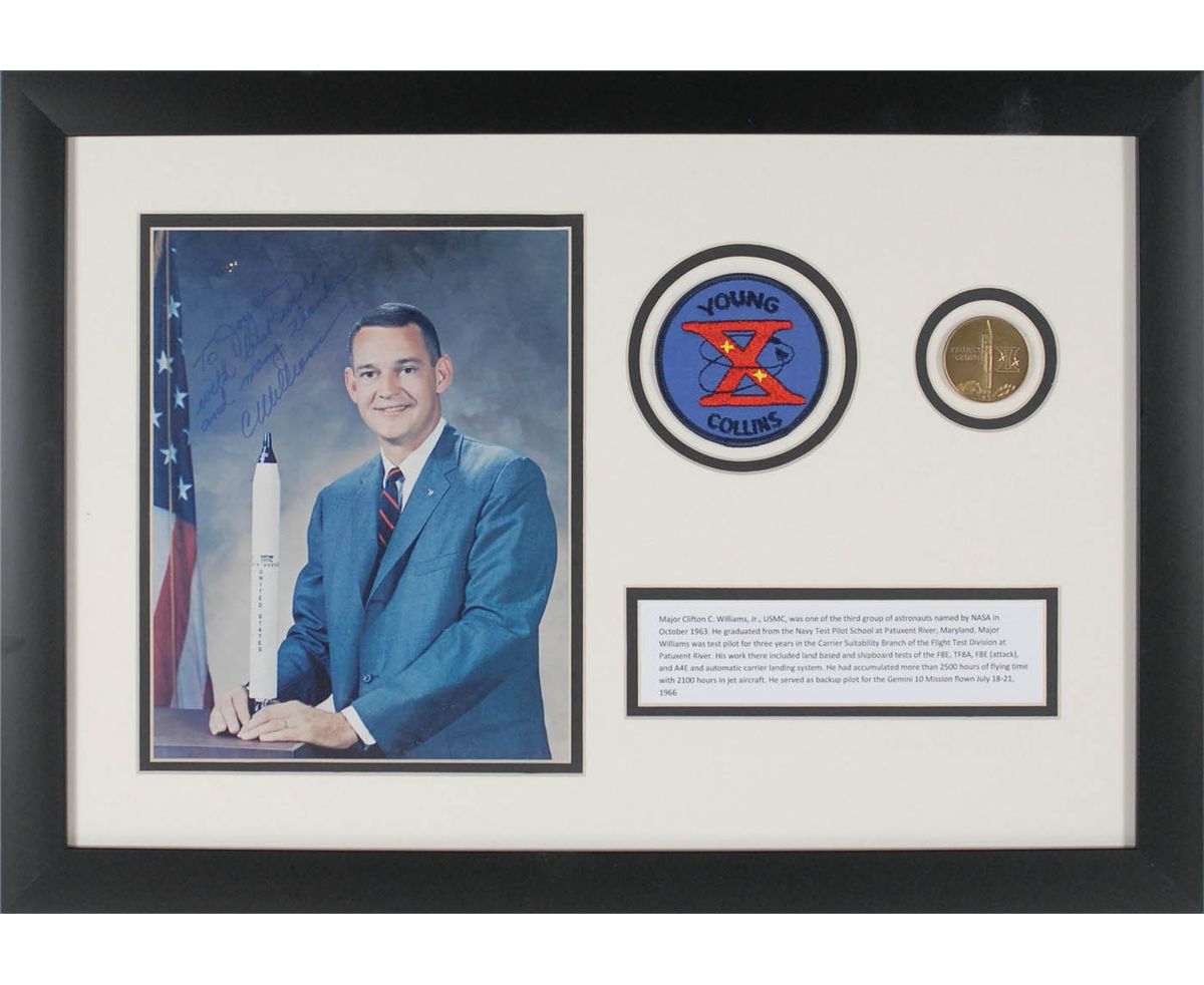 Very rare color official NASA 8 x 10 lithograph of Williams posing with a model rocket, signed and inscribed in blue felt tip, “To Joyce, with best wishes and many thanks, C. Williams.” Double-matted and framed with a Gemini 10 mission patch, medallion, and a printed biography to an overall size of 21 x 14.75. In fine condition. Williams died in a crash of a NASA T-38 jet trainer near Tallahassee, Florida, in 1968, before ever traveling into space. Inscribed to longtime NASA employee Joyce Abrams, who was a senior member of the ground support team.
