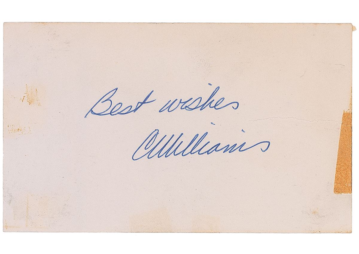Group Three astronaut (1932–1967) who died in a crash of a NASA T-38 jet trainer near Tallahassee, Florida. Ballpoint signature, “Best wishes, C. Williams” on an off-white 5 x 3 card. In very good condition, with a tear to right edge (approaching but not affecting the signature), toned tape remnants, and slight soiling.