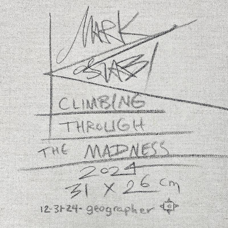 "Climbing Through the Maddness"is an original oil painting on canvas by Mark Kostabi, hand signed by the artist. This piece comes custom framed. Includes Certificate of Authenticity. Measures approx. 22" x 20" (frame), 12" x 10" (image). This item requires special handling and may have a longer than usual turnaround.